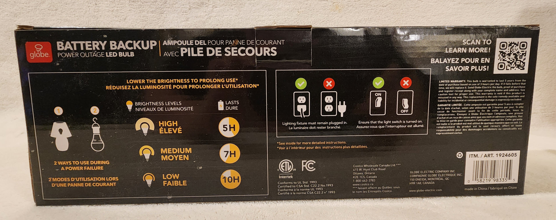 3000k Warm Light that provides a 10 hour backup when the power goes out its internal battery lasts up to 10 hours and senses through the light switch that the circuit is connected but there no power if both conditions are met it turns on your emergency lighting